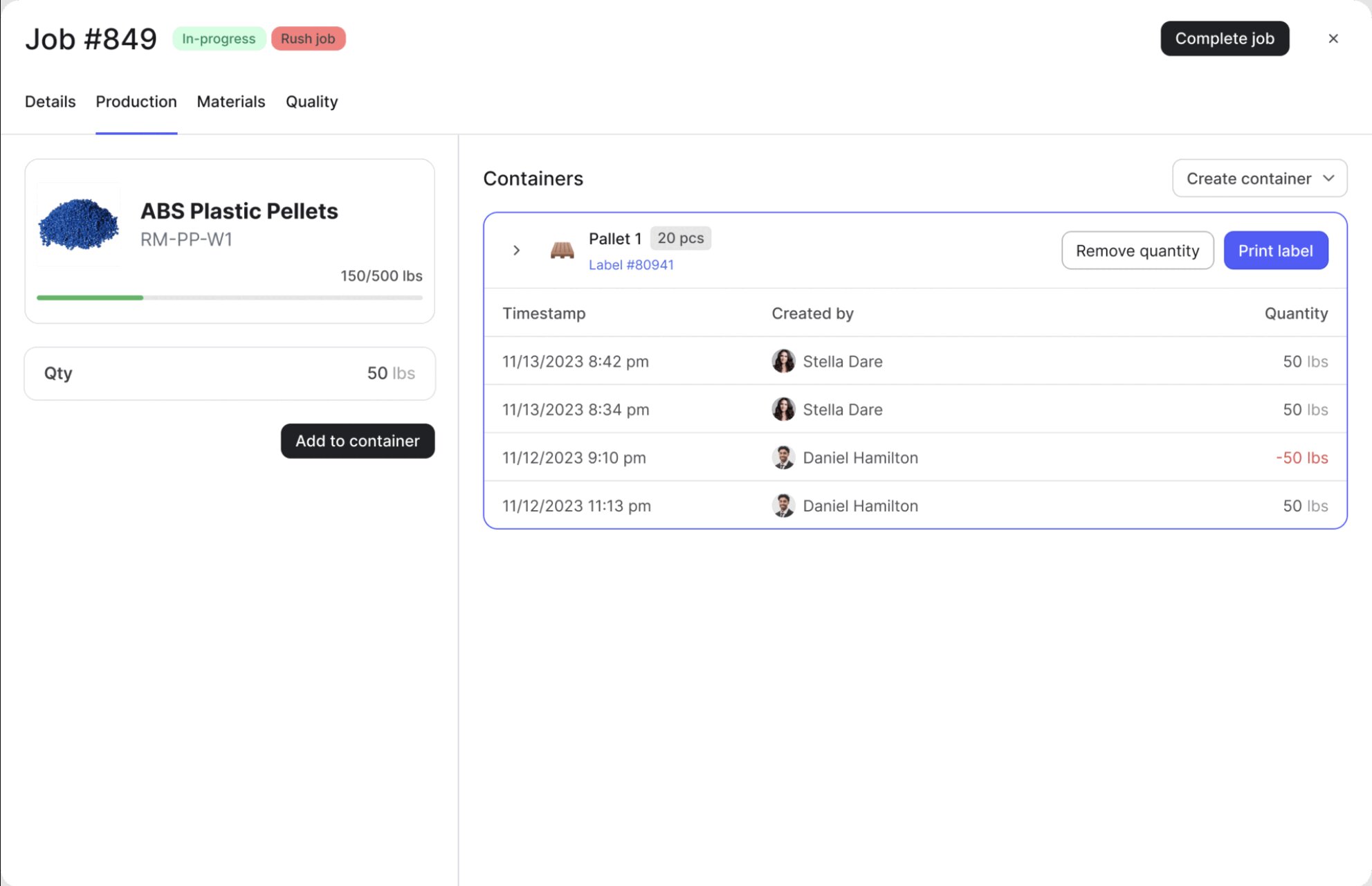 Users can create jobs, schedule them on a timeline, and check material availability before work begins. Operators can scan materials to deplete them, clock into jobs for labor tracking, follow instructions, and log progress. Shift leads can monitor job status and view material and labor costs, which feed into profitability reporting.