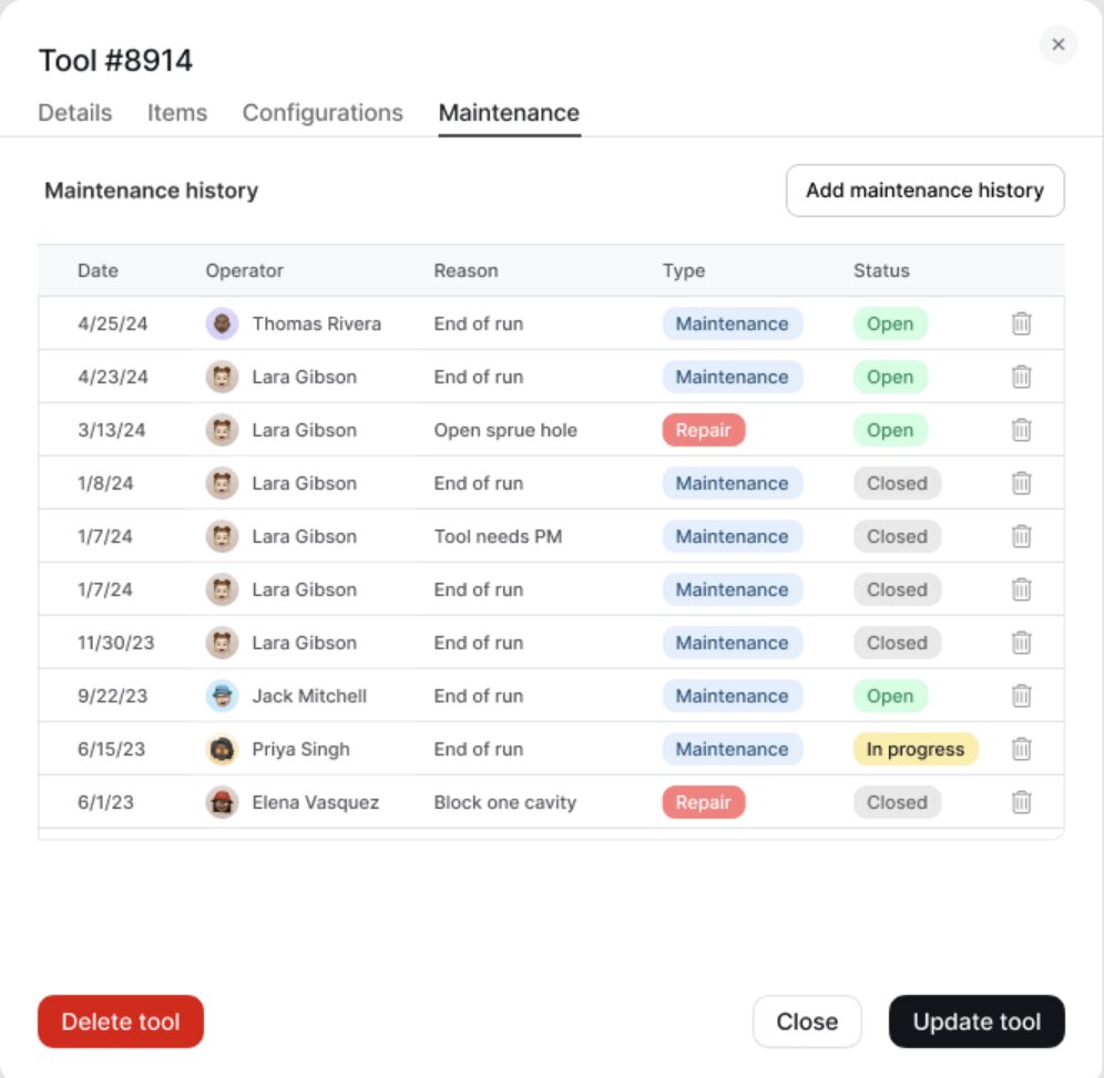 The system runs in a browser on any device, desktop or mobile, so teams on the shop floor, in warehouses, or across multiple sites can work in real time.