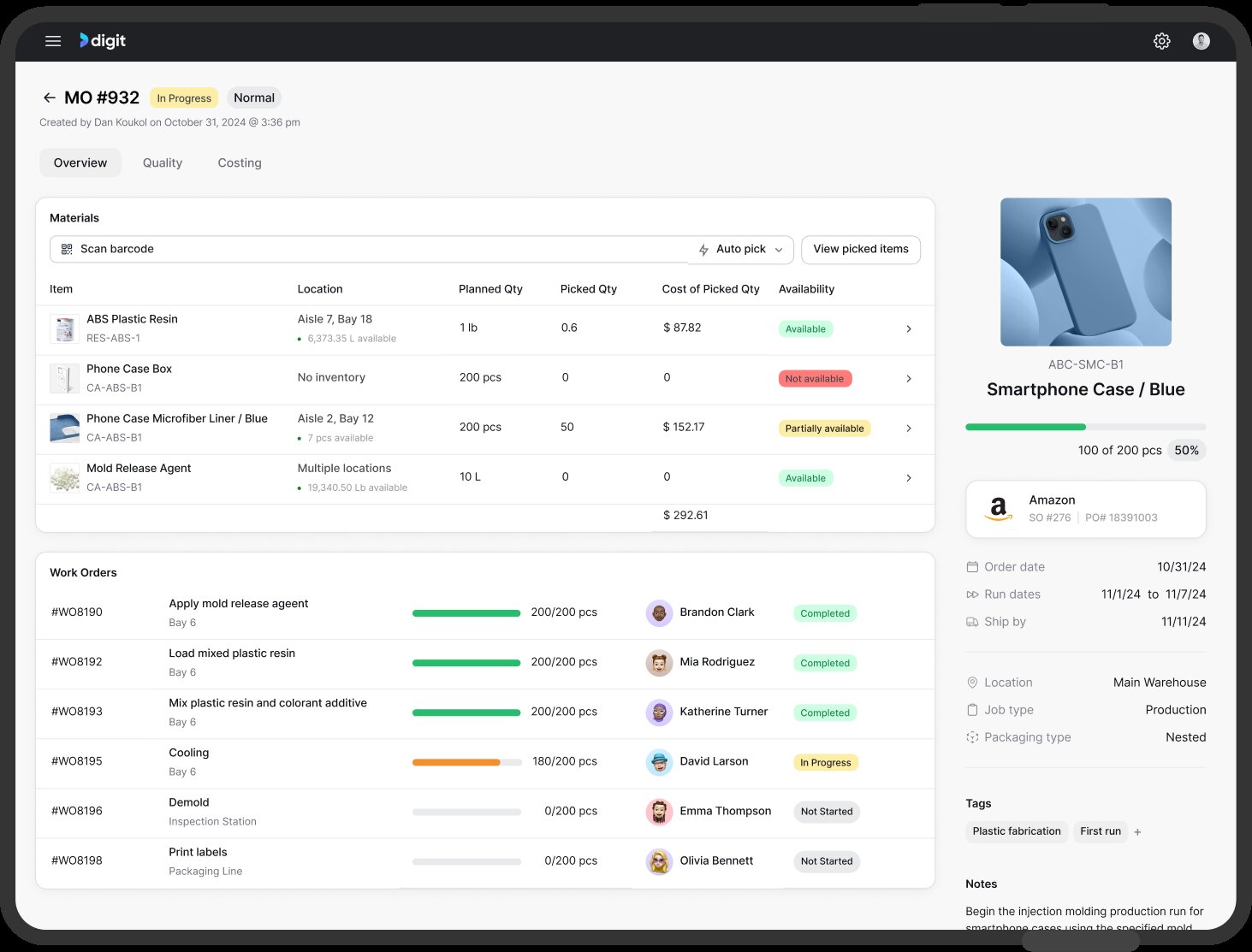 Digit also supports single and multi-level BOMs with version control, plus routings that outline each production step, associated work centers, and required tools.