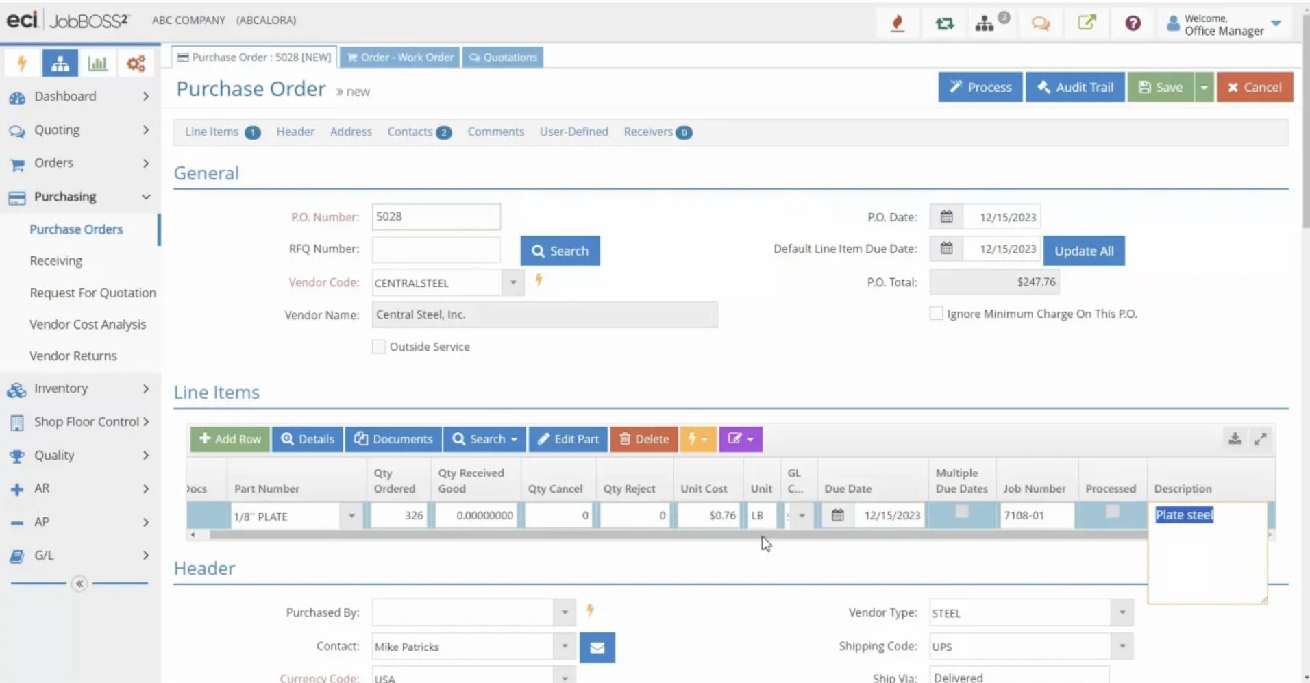 - Inventory and purchasing: The system tracks stock in real time, flags low inventory, and can automate purchase order generation based on job requirements or minimum stock levels.